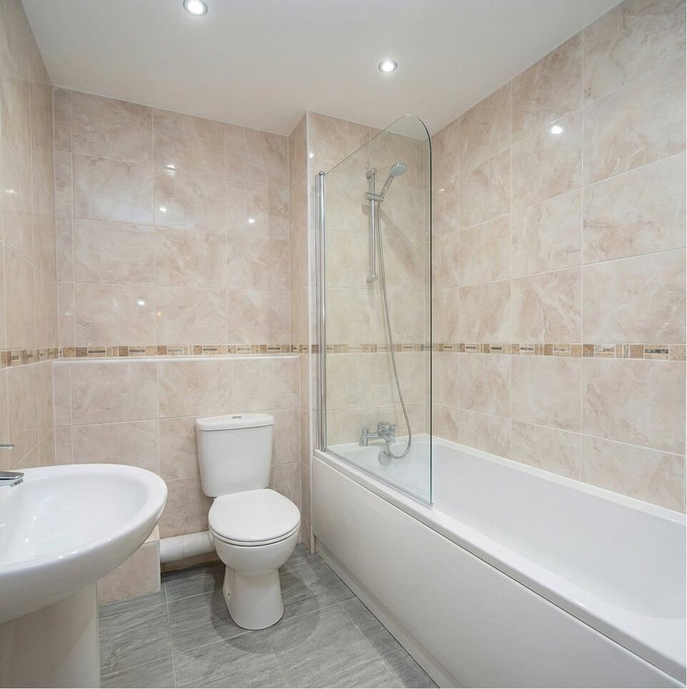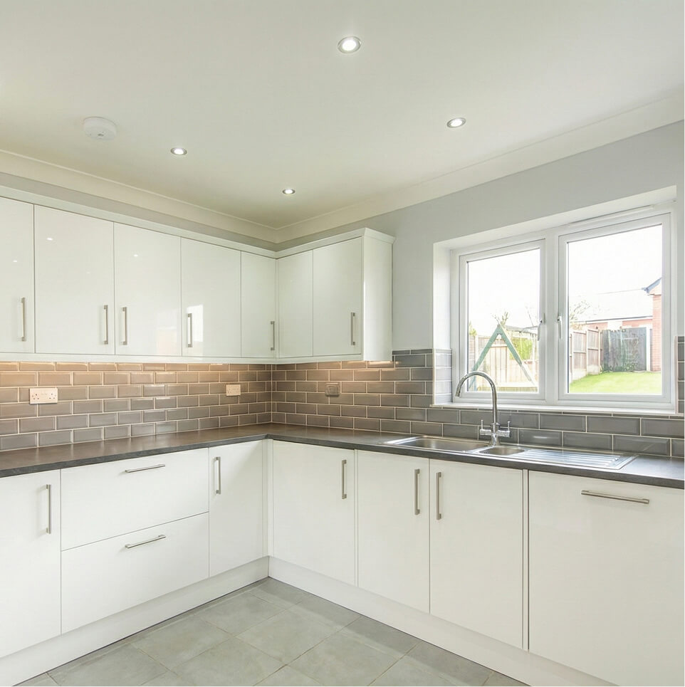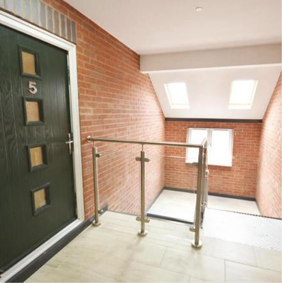 Moving inside, our network of specialist trades delivered a flawless, modern finish across all apartments and communal spaces. We installed high-gloss, contemporary kitchens featuring dark countertops and integrated spotlighting, alongside fully tiled, luxury shower rooms. The communal stairwells were elevated with skylights, exposed brick feature walls, and premium glass balustrades.