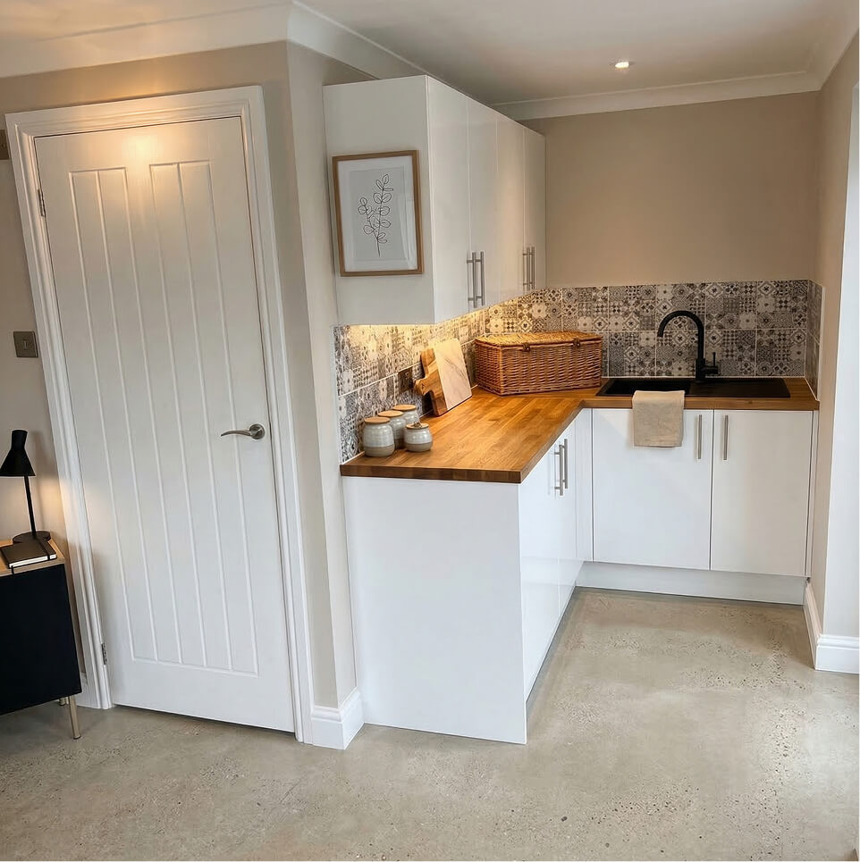 Check out our recent garage conversion in Manchester! We’ve transformed a standard garage in Dane Bank into a fully functional living space, complete with a modern bathroom, a stylish kitchen, and a comfortable lounge area. Outside, the project includes a beautifully crafted decking area and a spacious patio, perfect for relaxing or entertaining.