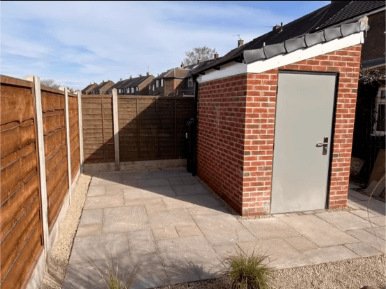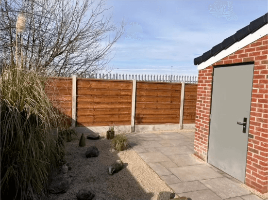 We’ve installed brand-new fence posts and panels, complemented by a sturdy new brick shed featuring a high-security door. The entire area has been beautifully finished with autumn brown Indian stone, creating a durable and stylish outdoor space.