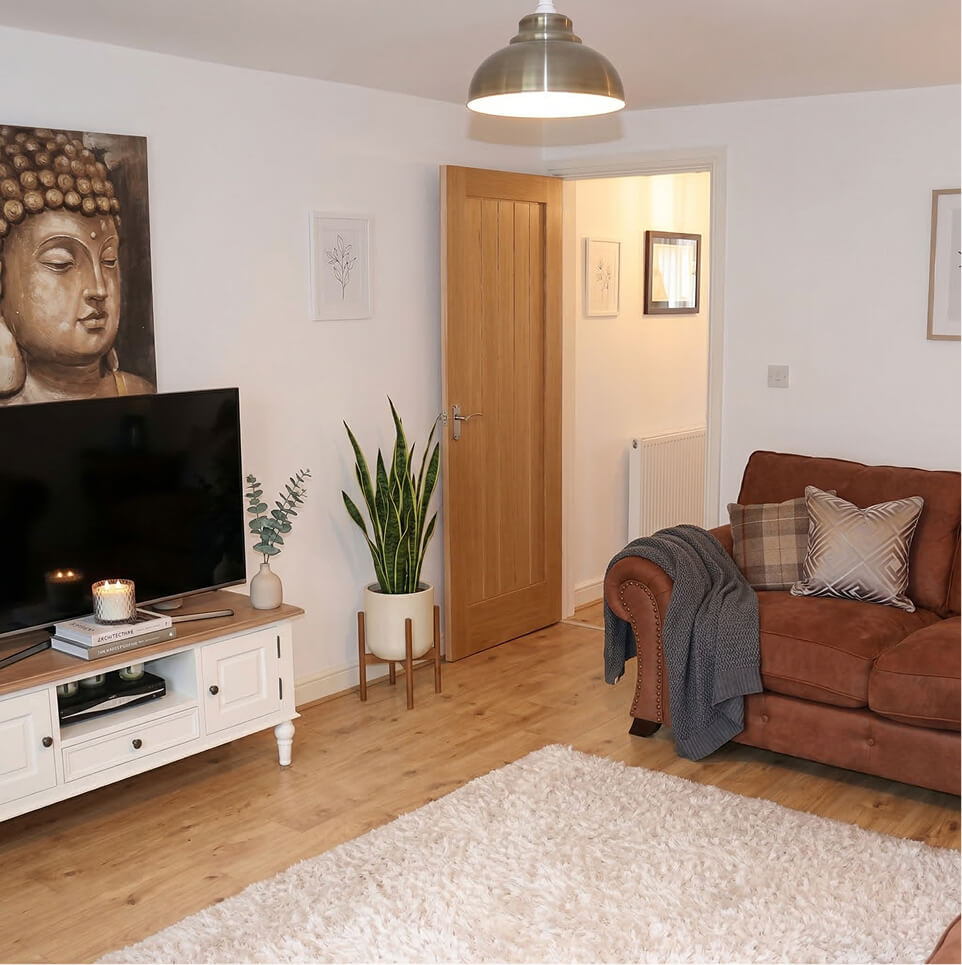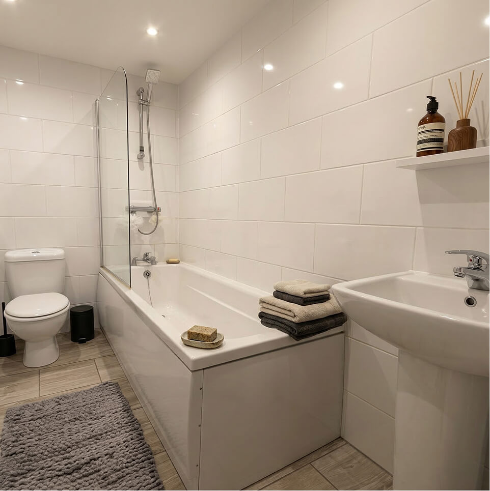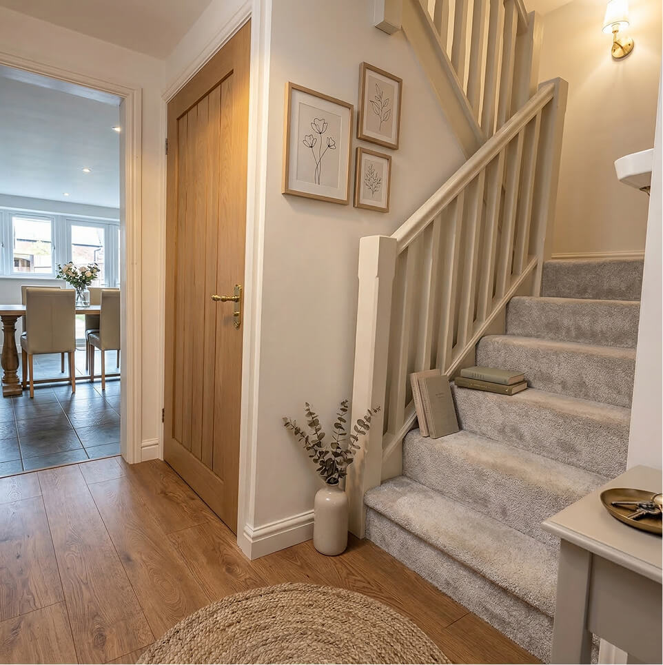 Moving inside, our trusted network of specialist trades delivered flawless, turnkey interiors across every single unit. We installed highly sought-after, contemporary kitchens featuring white gloss cabinetry, dark subway tiling, and premium integrated appliances. The family bathrooms were finished with pristine white tiling and modern fixtures. Throughout the living spaces, we fitted high-quality oak-style flooring, solid timber internal doors, and bespoke wooden staircases, guaranteeing a luxurious feel for future homeowners.