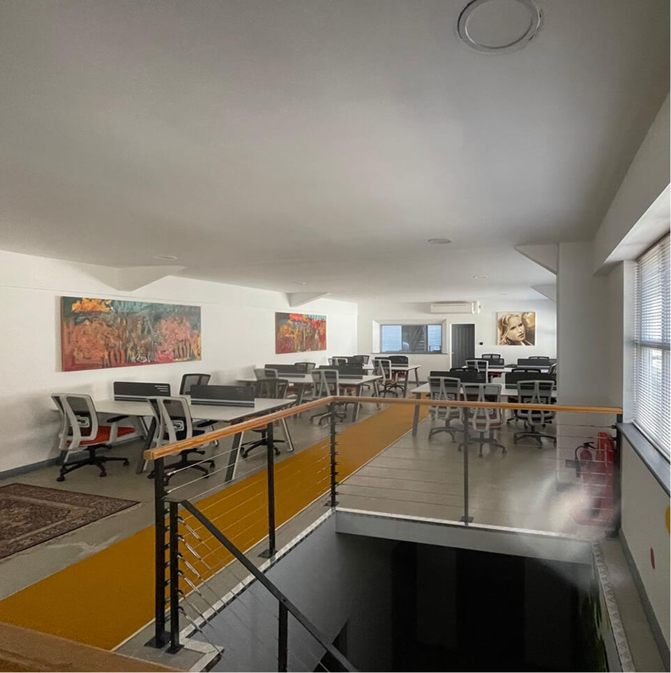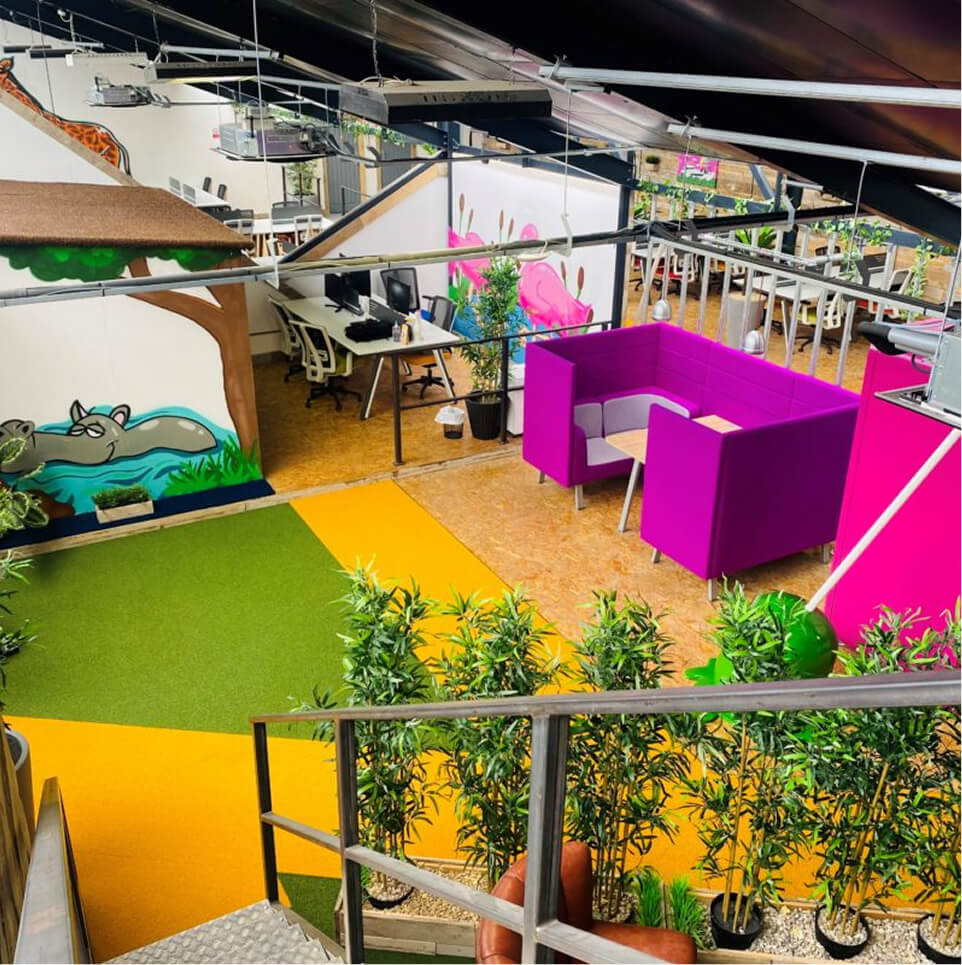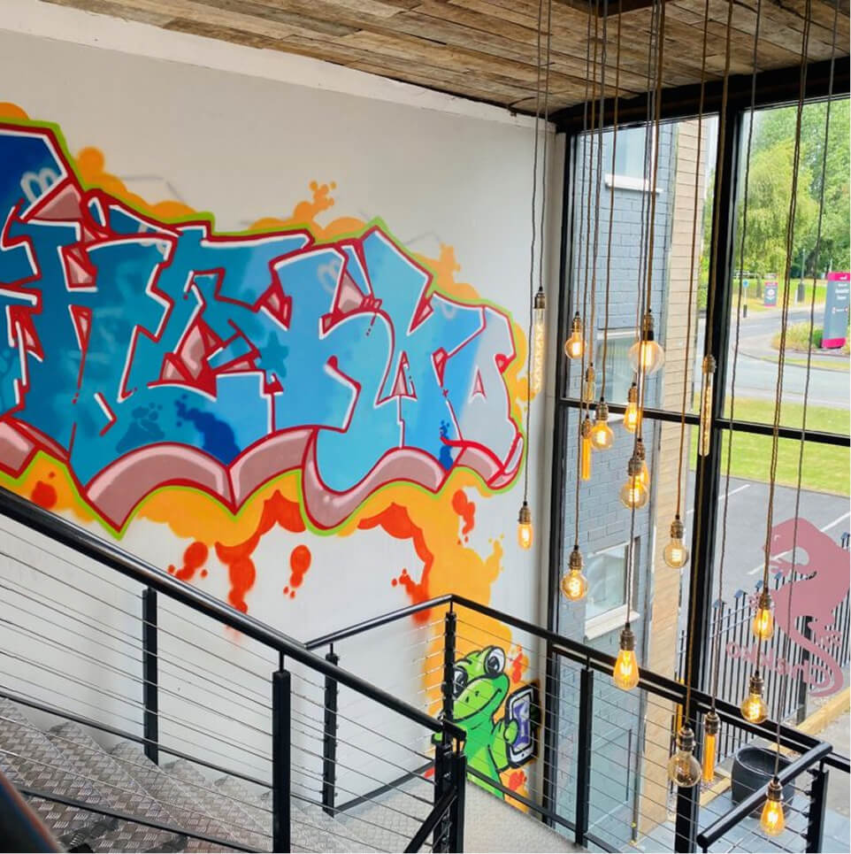 To capture the unique, creative spirit of the client’s brand, our interior fit-out team delivered highly stylised social spaces. We installed custom lighting solutions, including cascading Edison bulbs in a striking industrial stairwell adorned with bespoke graffiti art. The breakout zones were fully realised with bold visual murals, playful acoustic booths, and varied flooring textures to create distinct, energetic environments for collaboration.