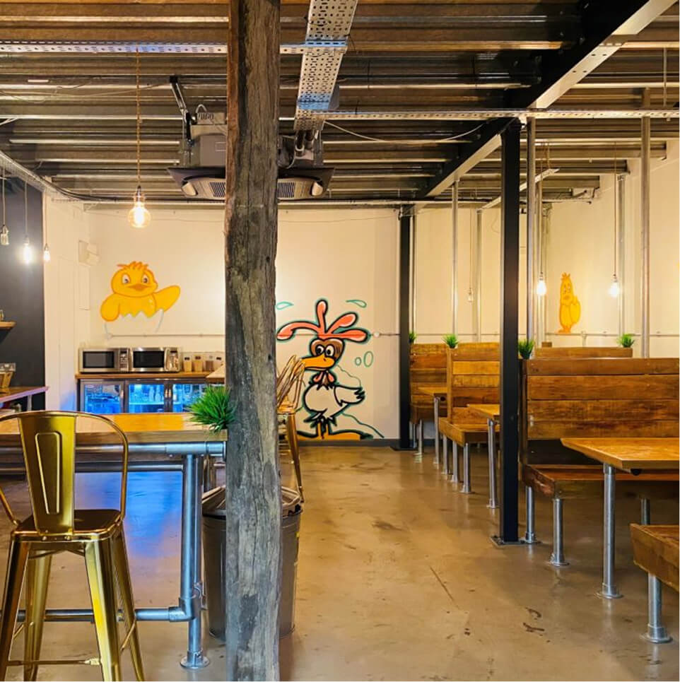 The project began with a complete overhaul of the existing building shell. We revitalised the exterior facade to create a sharp, professional commercial presence complete with dedicated parking and integrated signage. Internally, our team executed significant structural works, stripping the building back to reveal and restore its industrial framework. We proudly integrated structural steel pillars, exposed wooden beams, and industrial corrugated ceilings into the final aesthetic.