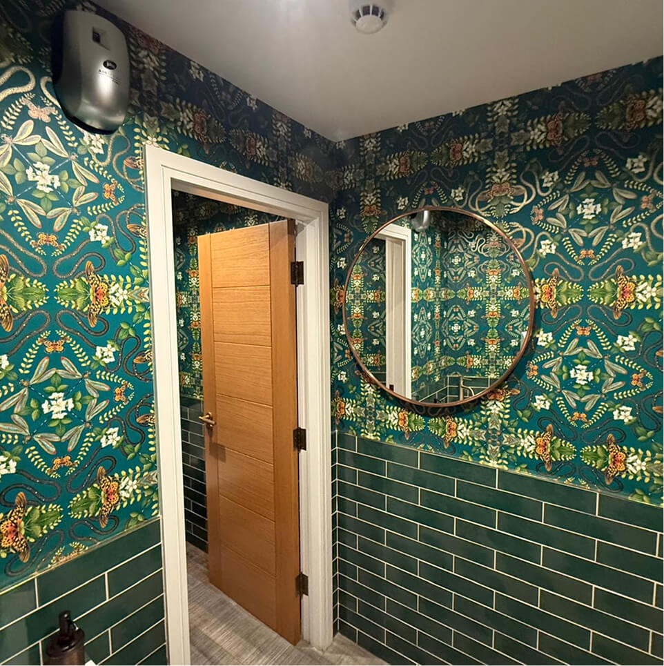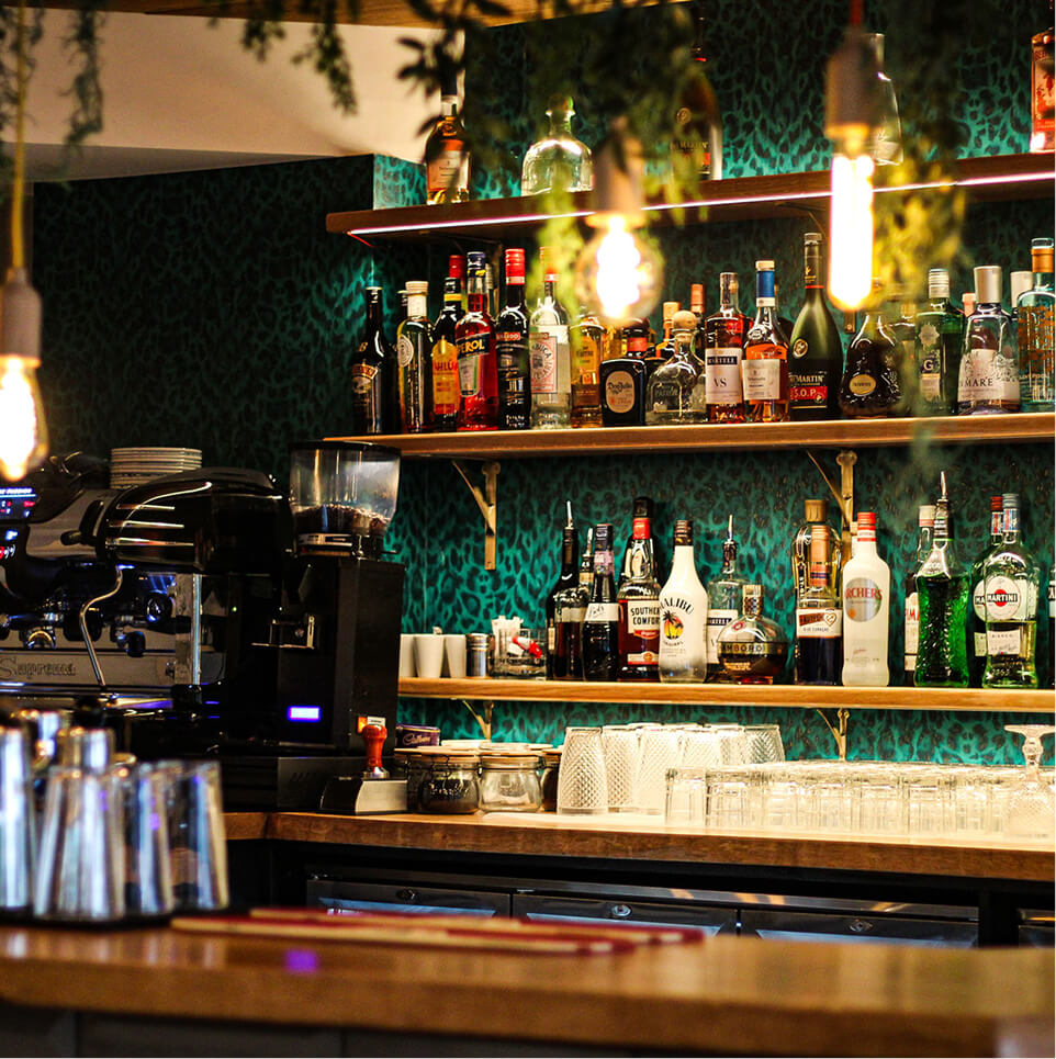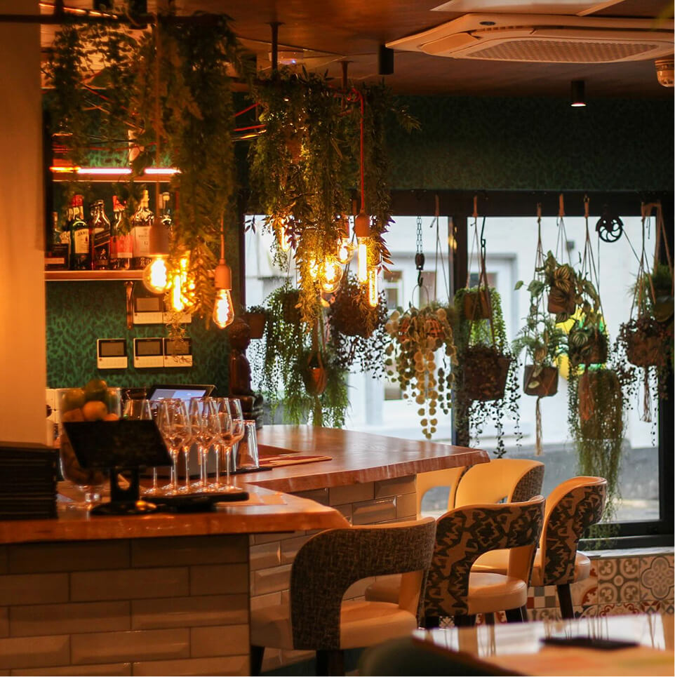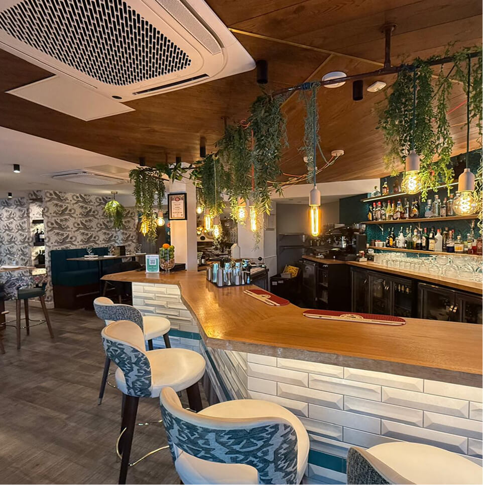 With the structural footprint secured, our specialist trades transitioned to the premium interior fit-out. We constructed a stunning, custom-built commercial bar serving as the focal point of the venue. The back bar features bespoke, illuminated shelving set against striking animal-print wallpaper, while the ceiling was engineered to support an elaborate, atmospheric installation of trailing foliage and cascading Edison pendant lighting.